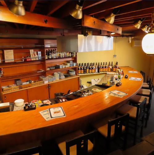 【カウンターで特別な時間★】当店ではカウンター席もご用意。目の前で作られる鉄板焼きを見ながら過ごす特別なひととき。木を基調とした温かみのある空間でいつも以上に会話が弾むこと間違いなし!落ち着いた雰囲気の中、当店自慢のお酒やお料理をお楽しみください。※カウンター席ではもんじゃ焼きのご提供はできません
